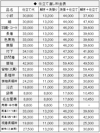 - 裄直し9,900円、身丈直し19,800円など分かりやすい料金設定で 着物を譲る際に必要な洗い張りや仕立てセットがお得な料金設定です。
