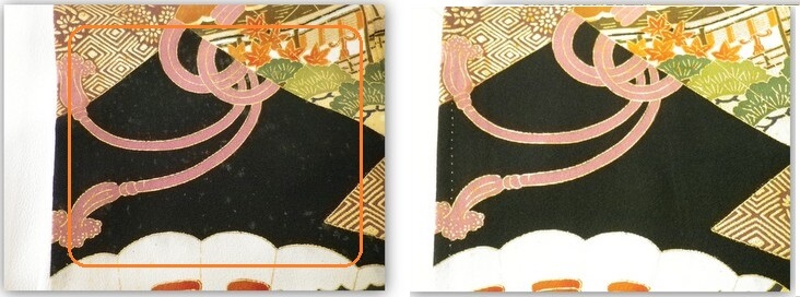 20年ぶりくらいに黒留袖を出すと右胸付近に横縞の色ムラが出来ていたとのことです。詳しい原因は分かりませんが、この状態では着用できないため何とか目立たなくしてほしいとのご相談でした。